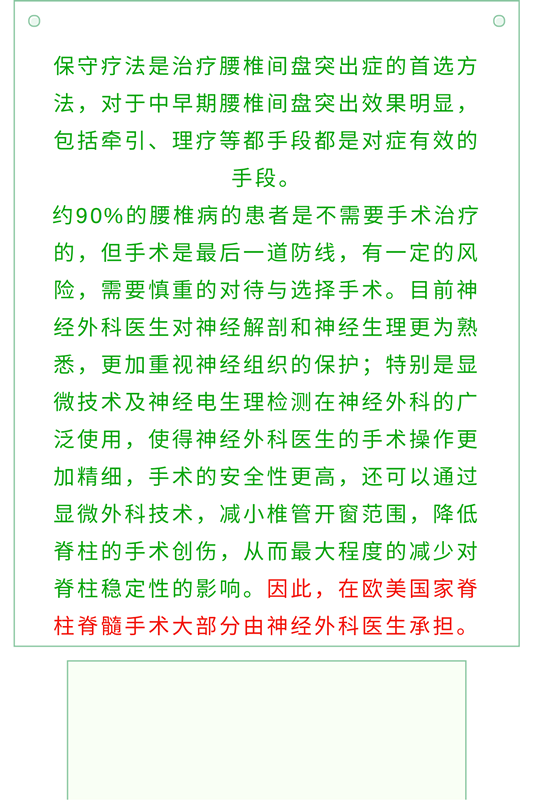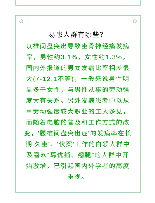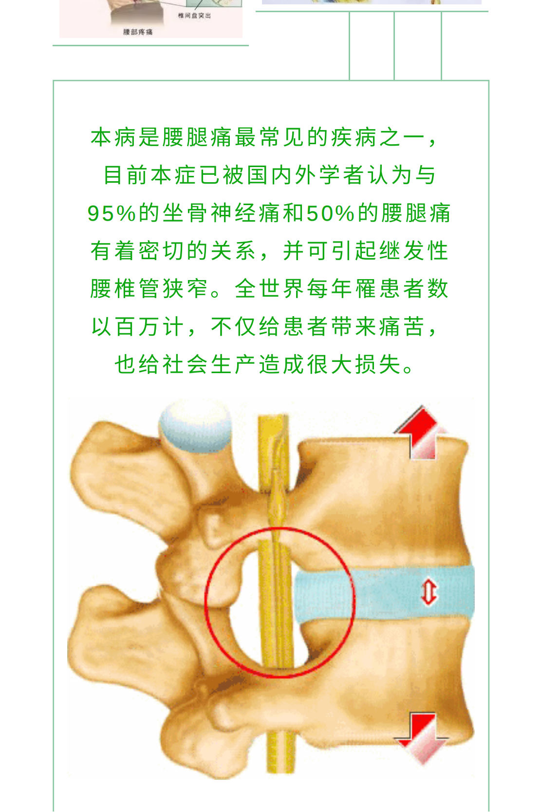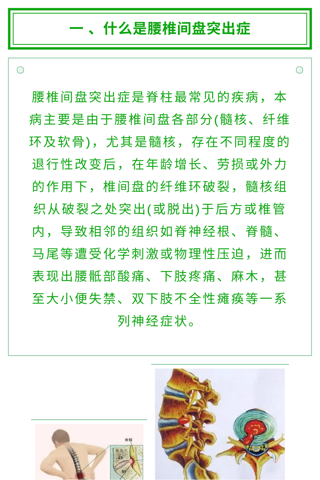 腰椎间盘突出症是脊柱最常见的疾病,本病主要是由于腰椎间盘各部分(髓核、纤维环及软骨),尤其是髓核,存在不同程度的退行性改变后,在年龄增长、劳损或外力的作用下,椎间盘的纤维环破裂,髓核组织从破裂之处突出(或脱出)于后方或椎管内,导致相邻的组织如脊神经根、脊髓、马尾等遭受化学刺激或物理性压迫,进而表现出腰骶部酸痛、下肢疼痛、麻木,甚至大小便失禁、双下肢不全性瘫痪等一系列神经症状。